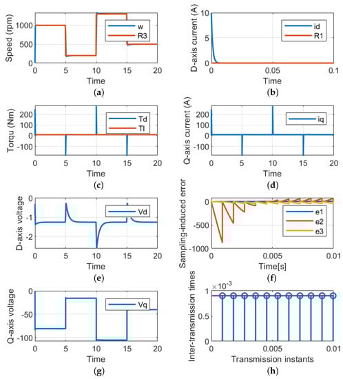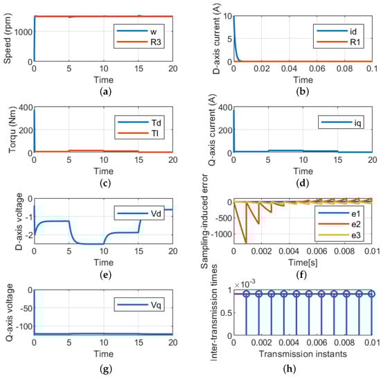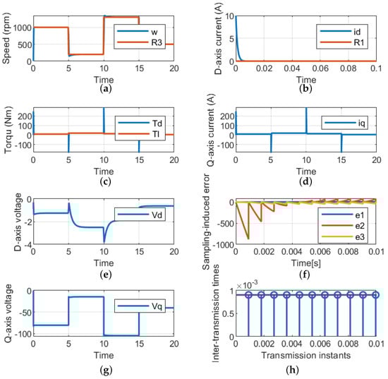 The LQR, which is based on the HCT, is used to examine the dynamic response of the PMSM drive system under step changes in the reference speed and constant load torque. The load torque is fixed at 5N while the speed profile is illustrated in Figure 5a. With a quick response and a roughly 0% steady-state error, the LQR is able to maintain the actual speed on the reference value’s trajectory. To ensure the MTPA, the control method also keeps the actual value of the d-axis current at zero references as illustrated in Figure 5b. However, the reference speed changes the developed torque from the machine and equals the load torque, as shown in Figure 5c. The corresponding q-axis current used to satisfy the load torque is depicted in Figure 5d. Under this working case, the values of the dq-axis voltages are shown in Figure 5e, where it can be observed that these values vary to satisfy the required reference speed and torque. For better validation of the suggested control technique, the sampling-induced errors for the three states are also presented in Figure 5f, where it can be seen that the error goes to zero. Finally, Figure 5h presents the relationship between the transmission instant and the inter-transmission time.