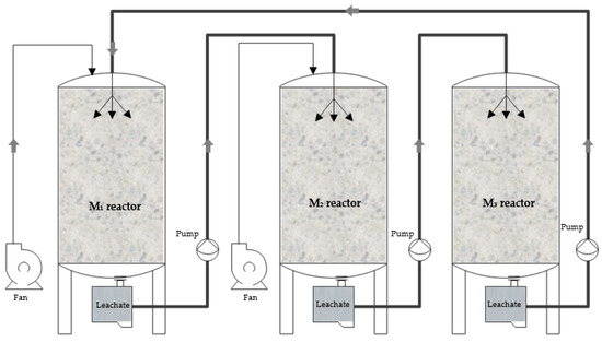 A spray nozzle is installed at the top of the reactor, and a plurality of fan-shaped nozzles is used. A peristaltic pump was used to spray the leachate from the top of the reactor. The number and angle of the nozzles are adjusted to achieve the design area of the spray. At the same time, leachate obtained from the landfill is used to backfill the M1, M2, and M3 reactors. As the M1 continues to produce leachate, the leachate generated in the reactor is backfilled to M2, whereas the leachate produced from the M2 reactor is backfilled to the M3 reactor based on the design value. If the leachate produced is not sufficient to meet the design value, the leachate obtained from the landfill site is used to supplement the remaining part. The relevant system is shown in Figure 2 and Figure 3 below: