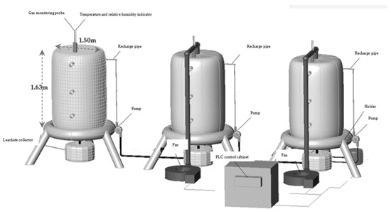 For the aeration, the reactor used a blower to aerate the waste in the reactor through a buried aeration pipe 50 cm long and perforated 1 m away from the reactor surface. The rector (M1) is filled with landfill waste with less than two years of landfill age that is sufficiently aerated with air, whereas reactor (M2) is filled with landfill waste of two to three years of landfill age intermittently aerated with air in the reactor every two days. Meanwhile, reactor (M3) is filled with landfill waste of five to nine years of landfill age without an aeration process.