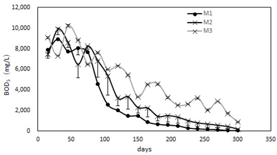 The BOD5 to COD (B/C) ratio, representing the ratio of biodegradable organic carbon in landfill waste, is a crucial indicator of waste stabilization, was shown in Figure 7. The experimental results demonstrated that the B/C values of the M1 and M2 reactors are 0.10 and 0.11, respectively, indicating that the waste in these reactors had undergone significant stabilization. The B/C value of the M3 reactor was relatively higher, at 0.39, suggesting that more time might be required to achieve complete stabilization. These findings are presented in the figure below, which displays the B/C data for each of the three reactors. Overall, these results indicate that the experimental design was successful in achieving waste stabilization.