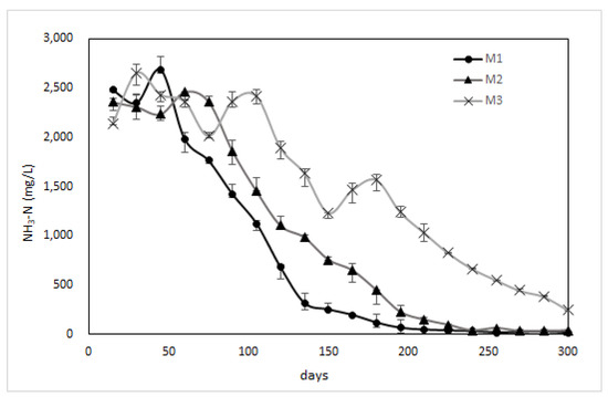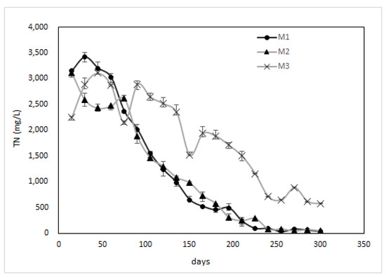 Moreover, the experiment demonstrates a significant reduction in NH3-N and TN concentrations in the M1, M2, and M3 reactors, with corresponding reduction rates of 99.2%, 98.3%, and 88.3% for NH3-N and 98.8%, 98.5%, and 74.6% for TN, respectively. These results indicate that the aerobic-semi aerobic-anaerobic process effectively aerated and oxidized the leachate in the reactors. The decrease in NH3-N and TN concentrations is illustrated in the figure below. The reductions in NH3-N and TN concentrations in the reactors were likely due to the combined effects of the nitrification and denitrification process, as well as the anaerobic degradation of nitrogen-containing organic compounds. Overall, these results suggest that the aerobic-semi aerobic-anaerobic process has the potential to serve as an effective method for the treatment of leachate from landfills. The trend of NH3-N and TN over time was shown in Figure 8 and Figure 9.