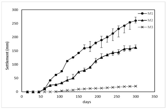 The settling rate is another important parameter that evaluates the stability of the waste landfill. After 300 days of weathering and joint treatment, the settling rate of the M1 reactor was found to be 260.5 mm, which is significantly higher than that of the M2 reactor at 162.2 mm. This difference can be attributed to the high proportion of organic matter present in the waste inside the M1 and M2 reactors and the positive impact of gas-water joint treatment technology on removing the organic matter from the waste. As a result, the waste in these reactors slowly settles down due to gravity. In contrast, the rate of degradation of the waste in the M3 reactor is limited; therefore, the settling effect is not obvious. The changes in the settling rate are shown in Figure 10 below, highlighting the significant increase in the settling rate in the M1 reactor after the treatment.