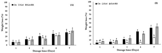 Daily weight loss (%) of coated fresh-cut Colocasia (A) and potato (B) samples during a 7-day storage period at 5 °C. Black columns indicate Ctr treatment; white columns indicate Gel treatment and grey columns indicate Gel-RS treatment. Different letters indicate statistical differences. Different letters within the columns indicate significant differences (p < 0.05) among the different treatments on every sampling date. Sample analysis was in triplicate.