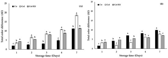Total color difference (ΔΕ) values of fresh-cut Colocasia (A) and potato (B) samples during a 7-day storage period at 5 °C. Black columns indicate Ctr treatment; white columns indicate Gel treatment and grey columns indicate Gel-RS treatment. Different letters indicate statistical differences. Different letters within the columns indicate significant differences (p < 0.05) among the different treatments on every sampling date. Sample analysis was in triplicate.