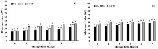 Whiteness Index (WI) of fresh-cut Colocasia (A) and potato (B) samples during storage period at 5 °C. Black columns indicate Ctr treatment; white columns indicate Gel treatment and grey columns indicate Gel-RS treatment. Different letters indicate statistical differences. Different letters within the columns indicate significant differences (p < 0.05) among the different treatments on every sampling date. Sample analysis was in triplicate.