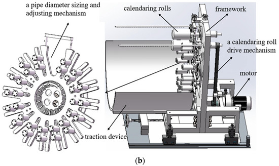 The equipment for this molding process consists of a plastic extruder, an embedded feeding nozzle [25], calendering rolls [26], a pipe diameter sizing and adjusting mechanism, a calendering roll drive mechanism, a power device [27], and a framework. By controlling the position of the nozzle, calendering rolls, and the pipe diameter sizing and adjusting mechanism, flexible molding of polymer pipes with multiple diameters can be achieved, as shown in Figure 1.