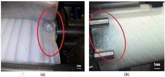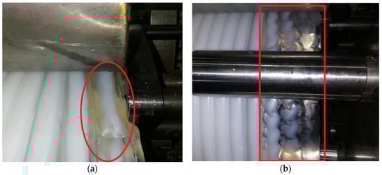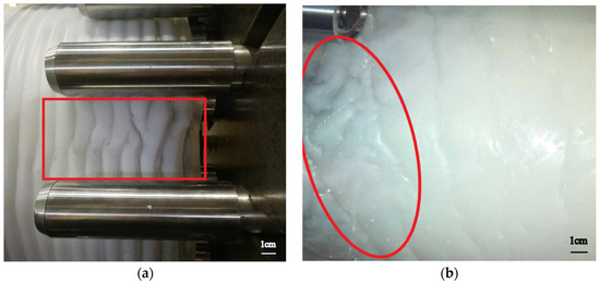 When the rolling speed is less than 3.5 rpm, it not only weakens the circumferential shearing force exerted on the pipe during the forming process but also affects the timely fusion of the newly extruded melt with the previous layer of the pipe blank, potentially causing surface slant and defects, as shown in Figure 5a. On the other hand, When the rolling speed approaches 5.5 rpm, it increases the circumferential shearing force on the pipe and enhances the circumferential orientation. This allows for rapid fusion between the newly extruded melt and the previous layer of the pipe blank, reducing heat loss during the fusion between layers. However, when the rolling speed exceeds 6 rpm, it increases the load and energy consumption during the rotation of the rolling roller, and may even lead to relative sliding between the rolling roller and the pipe blank, resulting in uneven surface and wrinkling of the pipeline, as shown in Figure 5b. Therefore, it is not advisable to simply increase the rolling speed to enhance the circumferential strength of the pipe by increasing the circumferential shearing force it experiences.