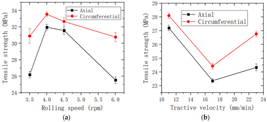 From Figure 6b, with the increase in tractive velocity, the tensile strength of the pipe first decreases and then increases, showing an overall decreasing trend. However, the effect of tractive velocity on the tensile strength of the pipe is not significant. Moreover, under the same tractive velocity, the circumferential tensile strength of the pipe is slightly higher than the axial tensile strength, but the difference between the two is not significant. This indicates that the circumferential and axial tensile properties of pipe are relatively uniform and can improve the utility of the pipe material.