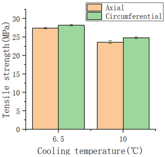 The experimental parameters were set as the lower cooling temperatures of 6.5 °C and 10 °C to investigate the influence of different cooling temperatures on the tensile performance of the pipes. From Figure 7, with the increase in cooling and shaping temperature, the tensile strength of the pipe tends to decrease. This is mainly because the cooling and shaping temperature affects the crystallinity and aggregation structure of HDPE. Furthermore, under the same cooling and shaping temperature, the circumferential tensile strength of the pipe is higher than the axial tensile strength, with a negligible difference. This indicates that the circumferential and axial tensile properties of the pipe are uniform, which is conducive to improving the utility of the pipe material.