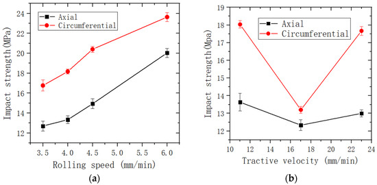 From Figure 8a, with the increase in rolling speed, the impact strength of the pipe increases. Moreover, under the same rolling speed, the circumferential impact strength of the pipe is higher than the axial impact strength. This indicates that the rolling speed has a significant influence on the impact strength of the pipe under the action of rolling. From the perspective of improving the impact performance of the pipe, the impact strength of the pipe material can be enhanced by increasing the rolling speed.