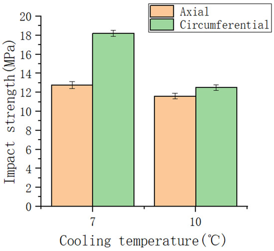 The melting behavior of pipes varies under different cooling temperatures, inevitably affecting their mechanical performance. With the experimental parameters of lower cooling temperatures, specifically 7 °C and 10 °C, an investigation was conducted to explore the impact of different cooling temperatures on the performance of the pipes. From Figure 9, the influence of different cooling and shaping temperatures on the circumferential and axial impact strength of the pipe shows that as the cooling and shaping temperature increases, the overall impact strength of the pipe slightly decreases. This is because the higher cooling temperature helps the molecular chains to fully stretch, improving the crystallinity inside the pipe. However, the increase in crystallinity tends to decrease the impact strength, which is consistent with the analysis of tensile strength results. Additionally, when analyzing under the same cooling and shaping temperature, it can be seen that the circumferential impact strength of the pipe is higher than the axial impact strength. This indicates that the pipe exhibits excellent circumferential impact resistance.
