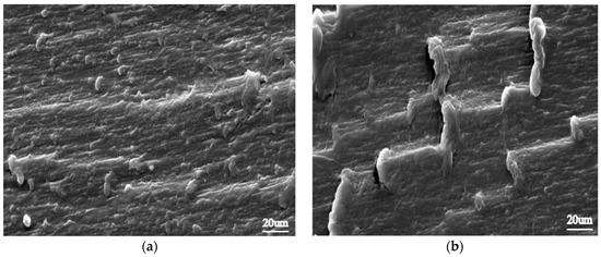 By comparing Figure 12a,b with Figure 12c,d, it is evident that as the rolling speed increases, the circumferential orientation of the pipe section is enhanced while the axial section becomes denser. Furthermore, by comparing Figure 12a,c with Figure 12b,d, significant differences in the circumferential and axial sections of the pipe are observed under the same rolling speed. The circumferential section exhibits clear orientation, whereas no apparent orientation is observed in the axial section. This is because the pipe has a higher degree of circumferential orientation than axial orientation. Moreover, with the increased rolling speed, the circumferential section experiences greater shear forces, resulting in a more pronounced orientation. This promotes faster spray deposition of the freshly ejected molten plastic onto the previous layer of the pipe blank, reducing heat loss and ensuring a stronger and denser fusion between layers.