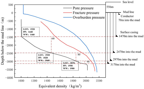 In conventional drilling, the drilling mud system is designed based on the pressure prediction profile from logging to maintain the bottom hole pressure within the safe window for a certain well section. However, the large pressure difference between the bottom hole and formation pressure can affect the rate of penetration (ROP) [34,35]. Therefore, to minimize the bottom hole pressure difference and improve the drilling efficiency, this paper adopted the dual-layer dual-gradient drilling method for a LS well, as shown in Figure 2, by continuously adjusting the bottom hole pressure to be within the safe density window and ensure a low bottom hole pressure difference.