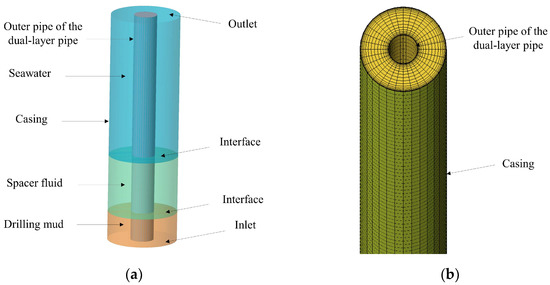 The geometric parameters used for the simulation are shown in Table 1. A three-dimensional model was established to simulate the annular fluid flow between the outer pipe of the dual-layer pipe and the casing. The ICEM divides the hexahedral mesh, and the grid is refined in the near-wall area, as shown in Figure 5.