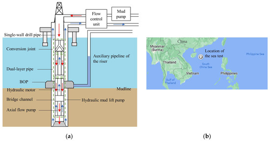 Offshore test of the dual-layer pipe dual-gradient drilling system: (a) offshore test schematic diagram; (b) location of the offshore test.