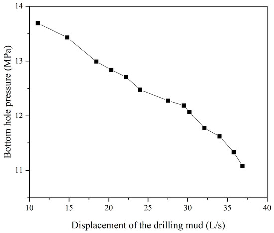 The experiment changed the displacement of the drilling mud to alter the head of the mud lift pump, thus regulating the bottom hole pressure. The experimental results are shown in Figure 11. It can be seen that the mud lift pump and experimental system we designed could reduce the bottom hole pressure by 2.67 MPa. This can be converted so that the equivalent density control range of the bottom hole at a 1000 m water depth is 271 kg/m3, which verifies the correctness and feasibility of the principle of dual-layer dual-gradient drilling technology.