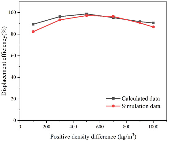 Based on the feasibility of the principle of the dual-layer pipe dual-gradient drilling technology, we verified the correctness of the established model. According to the literature, specifically [31] and [32], it can be seen that the flow characteristics of multiphase fluids in the annulus can be described by two parameters: the interface length and displacement efficiency. In this study, the displacement efficiency was indirectly used to verify the model’s accuracy. We extracted the displacement efficiency calculated with different density differences when the inclination angle of the uniform borehole wall is 0, as shown in Table 4 of Ref. [36], and compared it with the data obtained using the model simulation under the same working conditions explored in this paper. The result, as shown in Figure 12, indicates that the deviation of the simulation model used in this paper was less than 10%, which falls within a reasonable range.