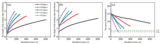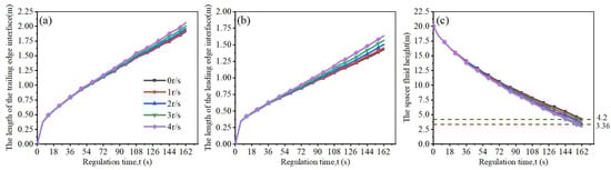 Effect of the rotation speed of the drill string on the distribution characteristics of the spacer fluid interface: (a) effect of drill string’s rotation speed on the length of the trailing edge interface; (b) effect of drill string’s rotation speed on the length of the leading edge interface; (c) effect of drill string’s rotation speed on the spacer fluid height.