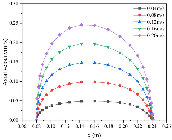 We analyzed the reasons for this phenomenon. As shown in Figure 20, in the tangential velocity cloud map, red represents the maximum, and blue represents the minimum. Therefore, the tangential velocity gradually decreased from the dual-layer pipe to the casing direction. The distribution pattern of the tangential velocity cloud map was consistent in the same cross-section at different rotation speeds. Still, there was a significant difference in the value of tangential velocity. The tangential velocity and the shear rate increased as the rotation speed increased. According to the shear thinning effect of pseudoplastic fluids, the apparent viscosity of the fluid decreases, resulting in an enhanced flow. Therefore, when the rotation speed of the drill string increased within the range of 0–4 r/s, the axial flow velocity of the fluid increased, the inhomogeneity of the axial velocity distribution increased, and the stability of the interface decreased.