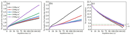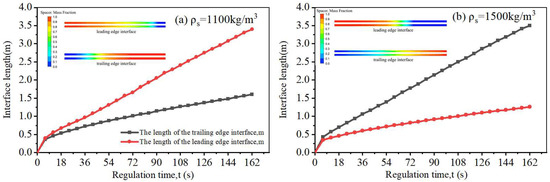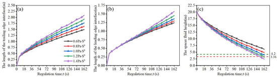 The spacer fluid is regarded as the interface between the seawater and drilling mud, and the stability of the spacer fluid interface refers to its ability to separate the seawater from the drilling mud. As shown in Figure 8, this paper evaluated the stability of the spacer fluid interface with the spacer fluid height in the annulus after a single adjustment of the bottom hole pressure as an index. In addition, the length and shape of the spacer fluid’s leading and trailing edge interfaces were used as auxiliary references.