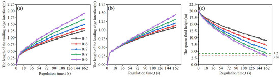 Effect of the liquidity index of the spacer fluid on its interfacial distribution characteristics: (a) effect of spacer fluid’s liquidity index on the length of the trailing edge interface; (b) effect of spacer fluid’s liquidity index on the length of the leading edge interface; (c) effect of spacer fluid’s liquidity index on its height.