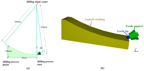 The interaction between the asphalt clothing and the milling cutter teeth during the milling process (Figure 1) is a very complex phenomenon that has been studied using numerical approaches [3,7,8,9,10,11,12,13,14] or experimental investigations [1,15,16,17,18].