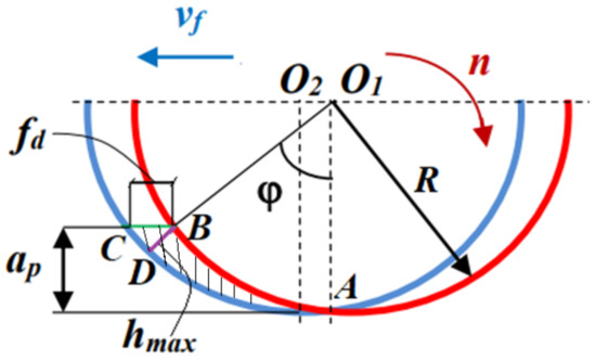 The maximum chip thickness (segment length BD) (Figure 7) is as follows [35]: