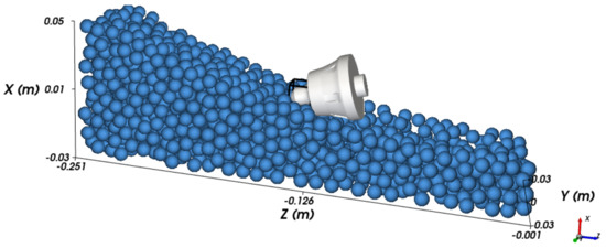 The interaction between the cutting tooth and asphalt pavement was simulated via the discrete element method using Rocky 2022 R2 version software. In order to reduce the computational time, spherical particles with 8 mm in diameter were used.