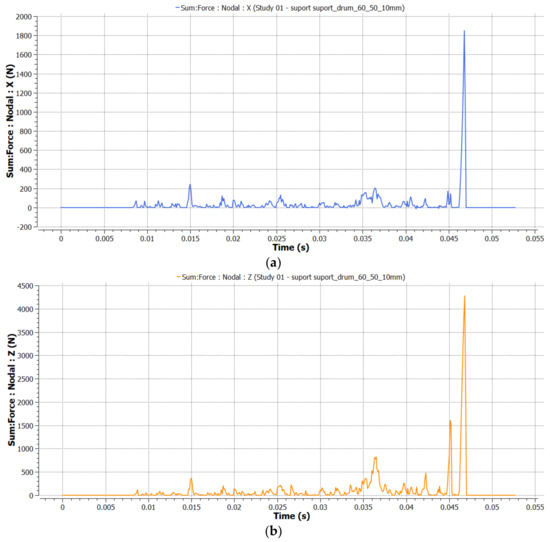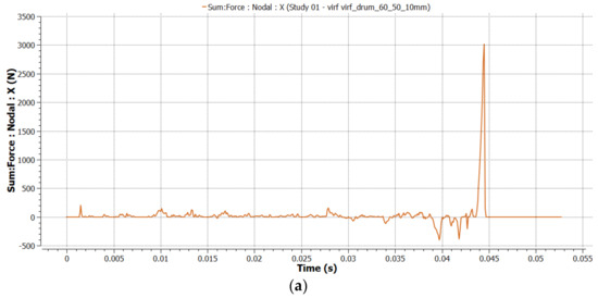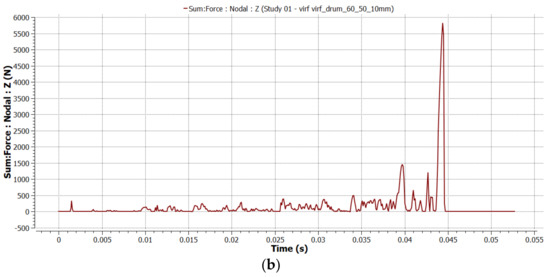 Also, the milling resistance is proportional to the chip section. For simplification, we considered that the milling resistance is proportional to the chip thickness. In these conditions, the maximum value of the total milling resistance on the tooth is proportional to the maximum chip thickness. Thus, to an acceptable first approximation, we considered the maximum values of the total milling resistance per tooth to be obtained by relating the values of the maximum milling resistance obtained as a result of DEM simulation (for a single tooth) to the number of teeth located on the same dislocation line.