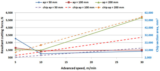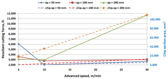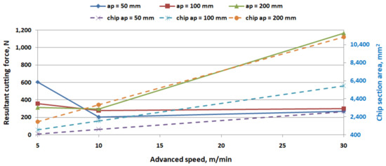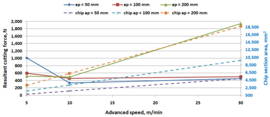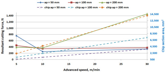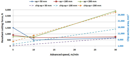 The graphs from Figure 23 indicate that the optimal combination of milling parameters for maximum chip section area are 200 mm milling depth and 30 mm/min advanced speed.
