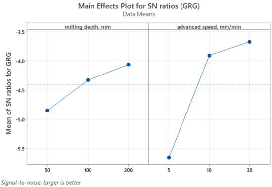 As can be seen in Figure 17, the maximum value of S/N ratio for GRC correspond to 200 mm milling depth and 30 m/min advanced speed. This conclusion is confirmed by the result obtained when a full factorial design analysis was used (see Figure 18).