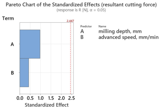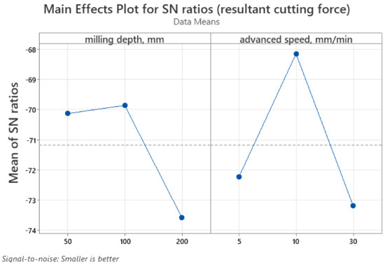 The results from Table 10 and Figure 19 and Figure 20 show that milling depth is the most significant factor for resulting cutting force, having a contribution of 14.41%. Similarly, in [27,33] it was shown that the cutting depth was the most important parameter affecting the resultant force.