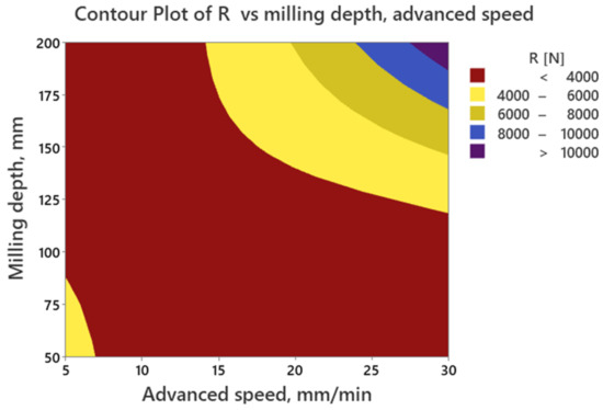 In Figure 21, we present the contour plot for cutting resultant force in order to highlight the interaction and pattern between the considered variables. Analyzing this graph, it can be observed that for avoiding great cutting forces on the milling tooth, an advanced speed greater than 25 m/min and a milling depth greater than 175 mm should not be used.