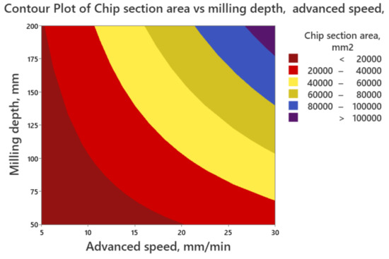 The contour plot from Figure 24 shows that as the milling depth and advanced speed increase, the chip section area becomes greater, leading to improved milling process efficiency.