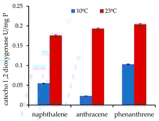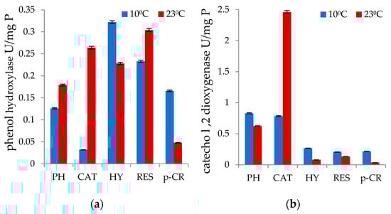Consistent with these results, phenol hydroxylase activity with the tested monophnolic substrate was shown to be 3.46-fold higher and catechol-1,2-dioxygenase activity was 6.6-fold higher at 10 °C than it was at 23 °C (Figure 1a,b). The same occurrence was observed in the measured phenol hydroxylase activity values for hydroquinone degradation.