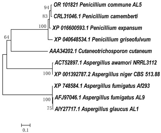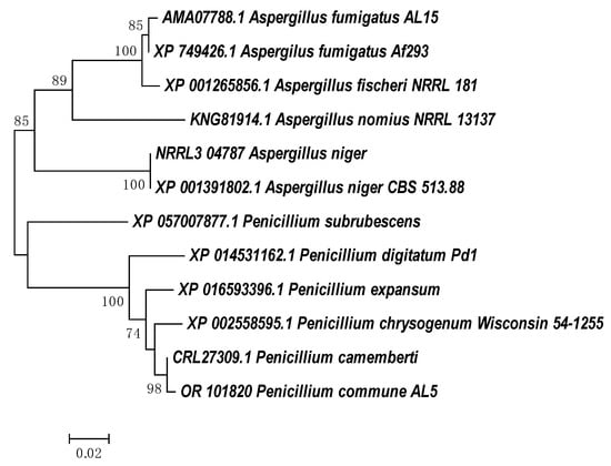 Despite the large number of studies on the degradation of aromatic compounds by eukaryotic microorganisms, information on the genes relating to degradation enzymes is not widely available in the NCBI database. Cladograms showing the phylogenetic closeness of the amino acid sequences defining the enzymes with phenol hydroxylase and catechol 1,2 dioxygenase activities in strain P. commune AL5 are shown in Figure 3 and Figure 4, respectively. The partial protein sequences for both enzymes that we obtained shared the highest degree of similarity with sequences from a member of the genus P. camemberti (CRL31046.1 and CRL27309).