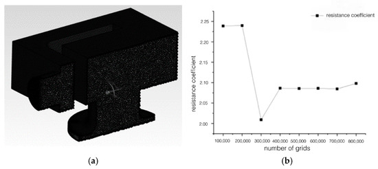 Computational domain and results for the inner runner of the air distributor. (a) Inner flow channel computational grid. (b) Different grid calculation results.