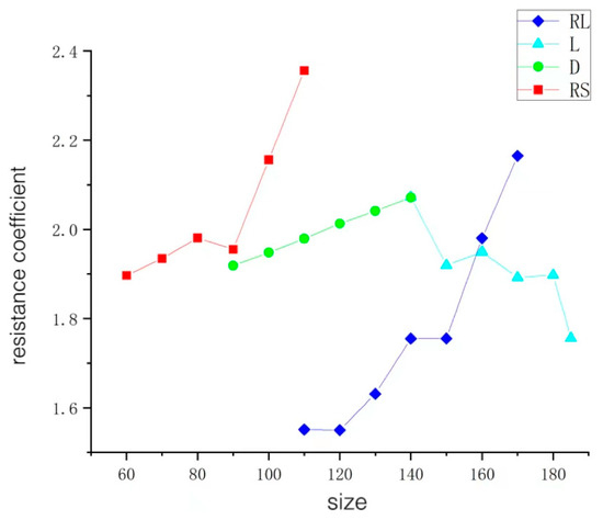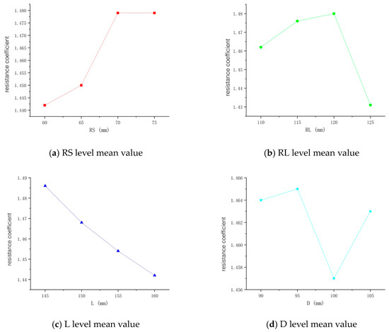 In Table 5 and Figure 5, it can be concluded that RL has the greatest influence on the resistance coefficient, and is the main influencing factor, followed by L, RS, and D, which has the least influence on the resistance coefficient. In Figure 5a, it can be seen that the resistance coefficient is the lowest when RS = 60 mm. In Figure 5b, it can be seen that the resistance coefficient is the lowest when RL = 125 mm. In Figure 5c, it can be seen that L is negatively correlated with the resistance coefficient, and the resistance coefficient is the smallest when L = 160 mm. From Figure 5d, it can be seen that when D is 100 mm, the structure size with the lowest resistance coefficient can be obtained. Finally, the scheme with the lowest resistance coefficient can be obtained when S = 60 mm, RL = 125 mm, L = 160 mm, and D = 100 mm.