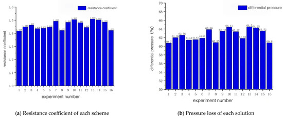Figure 4, drawn from the calculated data, shows intuitively that the resistance coefficient and pressure loss of scheme 8 are the lowest. As shown in Figure 4a, compared with the original scheme, the resistance coefficient of the new U-shaped channel design is significantly reduced, to below 1.6. As shown in Figure 4b, the pressure loss of the new flow channel design scheme is reduced from the original 106.84 Pa to below 65 Pa; the resistance coefficient of scheme 1 is reduced to 1.418, and the pressure difference is reduced to 60.7 Pa.