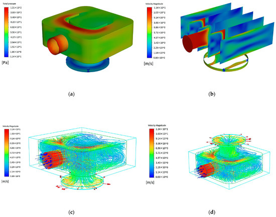 Numerical simulation results of U-shaped air distributor. (a) Air distributor pressure cloud diagram. (b) Wind speed cloud diagram. (c) The internal streamline diagram of the air distributor (positive axis mapping). (d) Internal streamline diagram of air distributor (reverse axis mapping).