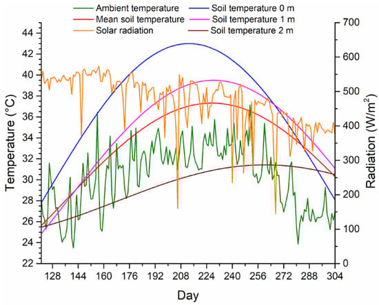 Figure 3 shows the variation of daily ambient temperature, soil temperature, and solar radiation averages during the warm season (May–October), since these are the two surrounding mediums with which the thermal energy storage tank of the solar absorption cooling system exchanges heat. Although the ambient temperature reaches values of 40 °C during sunny hours in the period from June to September, at night it presents values between 25–30 °C, which increases the temperature difference with respect to the tank temperature (≈90 °C) and, subsequently, the heat losses.