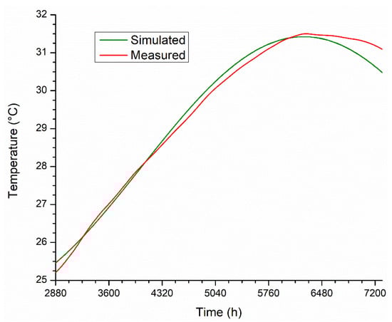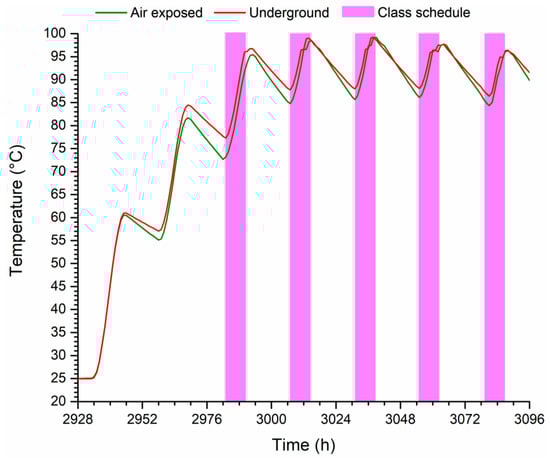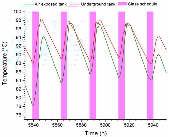 Figure 8 shows that the temperature in the underground tank has a more stable dynamic during the highest classroom thermal load week, and the amplitude of the temperature variation is lower compared with the air-exposed tank. At the first hour of Monday (5833 h), the temperature of the buried tank is 91.6 °C, whereas the temperature of the air-exposed tank is 82.75 °C. During school hours, when water is extracted from the tank to activate the absorption cooling system, the temperature difference in the tanks decreases considerably. At the end of the week, the temperature of the underground tank is 91.1 °C and 85.8 °C for the air-exposed tank.