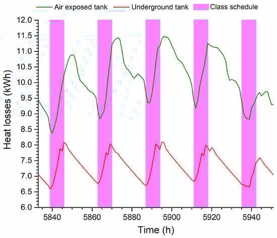Figure 9 shows that the temporal variation of heat losses follows the same trend as the water temperature in the tank, because as the temperature in the tank increases, the temperature difference with respect to the heat sink (air or soil) increases. The underground tank reduces heat losses during the critical week by 27.33% compared with the air-exposed tank. The maximum rate of thermal energy that dissipated to the soil surroundings is 8.1 kWh, while, for the case of the air-exposed tank, this is 11.5 kWh. The increase/decrease in thermal energy dissipated to the soil surroundings has a more linear trend because the soil temperature change during a day is negligible, as opposed to ambient air which has a greater temperature variation.