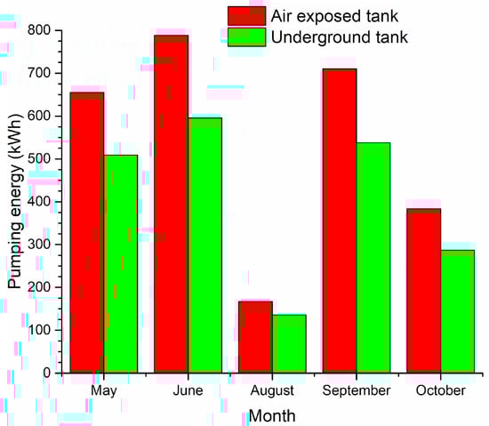 Figure 10 shows the electrical energy savings generated by the reduction of pumping time, because the pump that circulates water between the tank and the solar collectors turns on when the temperature at the solar collector row outlet is higher than the temperature of the tank. The reduction in thermal energy losses in the underground tank causes its temperature to be higher than the outlet temperature of solar collectors for a longer period of time. Monthly electrical energy savings were 146.21 kWh (22.3%) in May, 193.2 kWh (24.5%) in June, 31.3 kWh (18.7%) in August, 172.32 kWh (24.26%) in September, and 96.6 kWh (25.17%) in October.