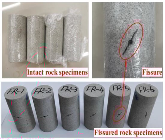 The rock samples were collected from deep-buried sandstone strata from coal mines in Huainan coal field, China. The rock samples were processed into standard cylindrical specimens, with a diameter of 50 mm and a height of 100 mm, according to ISRM’s suggestions []. In order to investigate the mechanical properties of fractured rocks under triaxial compression conditions, fissured rock specimens were fabricated. The fissures were cut at the center of the processed rock specimens, with a length of 20 mm and a width of 1 mm. The fissure dip angles were assigned values of 0°, 15°, 30°, 45°, 60°, and 90°, as depicted in Figure 1.