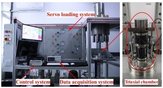 The experiments were carried out utilizing a ROCK 600-50HT rock mechanics testing system manufactured by TOP INDUSTRIE from France, as illustrated in Figure 2. The ROCK 600-50HT testing system comprises a control system, triaxial chamber, servo loading system, and data acquisition system. The system has a maximum axial loading capacity of 1000 kN, a maximum confining pressure of 60 MPa, and a maximum displacement capacity of 25 mm.
