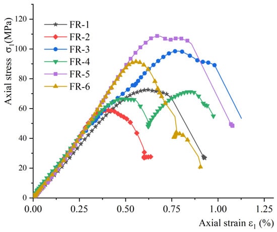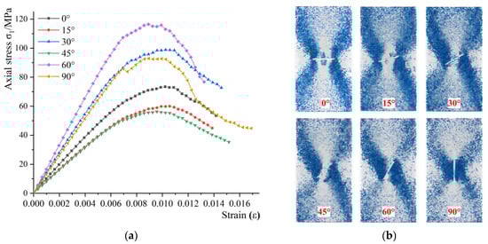 Figure 3 illustrates the stress–strain curves for the fissured specimens. The stress and strain values have near linear relations at the beginning stage of the tests. Subsequently, the stress–strain curves for the specimens experienced fluctuations before reaching the peak stress. This phenomenon could be caused by crack mobilization. The stress–strain curves turned from approximate straight lines to curves when approaching the peak stress. As shown in Figure 3, it can be noted that at a confining pressure of 30 MPa, the rock specimens begin to exhibit significant ductility. The peak stress values of the fissured specimens are shown in Table 2. The decrease in the peak stress tends to increase and then decrease with the increase in the dip angles in the fissures. The impact of fissures on the mechanical properties of rocks is most pronounced at a dip angle of 45°.