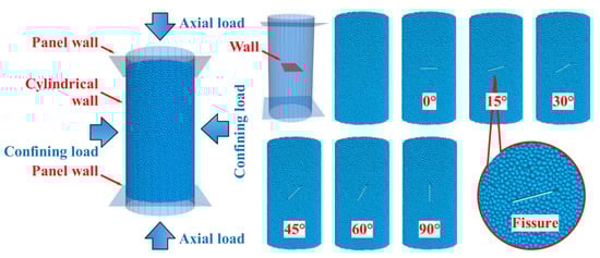 Different experimental tests on rock specimens containing fissures have been conducted and the mechanical parameters, as well as the failure behaviors, of fissured rocks have been analyzed. Nevertheless, some drawbacks have been encountered during the implementation of experimental tests. For example, only the stress and strain distribution and evolution behaviors on the surface of rock specimens can be measured. Moreover, the failure processes of rock specimens cannot be clearly observed in experimental tests. Therefore, numerical tests on fissured rock specimens have been conducted by researchers. Zare conducted numerical tests on rock-like specimens containing fissures and compared them with experimental tests []. Zhao established particle flow models of rock samples with flaws and conducted numerical tests []. The influence of the inclination angle on the mechanical properties and crack propagation behaviors of the specimens were examined. Manouchehrian carried out numerical tests on rock specimens with notches under triaxial compression to investigate the influence of the notch length on the fracturing behavior of the specimen. Wang studied the mechanical behaviors of sandstone containing a single open fissure under uniaxial compression by conducting numerical tests []. Feng investigated the influence of two unparalleled fissures on the mechanical behavior of rock-like specimens subjected to uniaxial compression through numerical tests []. Wang studied crack coalescence modes and micro-crack propagation law of fissured sandstone specimens by conducting numerical uniaxial tests []. Chen established a discrete element model of rock specimens containing X-shaped fissures and conducted uniaxial compressive tests. The influence of fissures on the mechanical properties of rock specimens were investigated [].