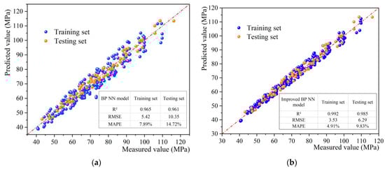 Comparison between the predicted values and measured values under the conventional and improved BP neural network model: (a) conventional BP neural network model; (b) improved BP neural network model.