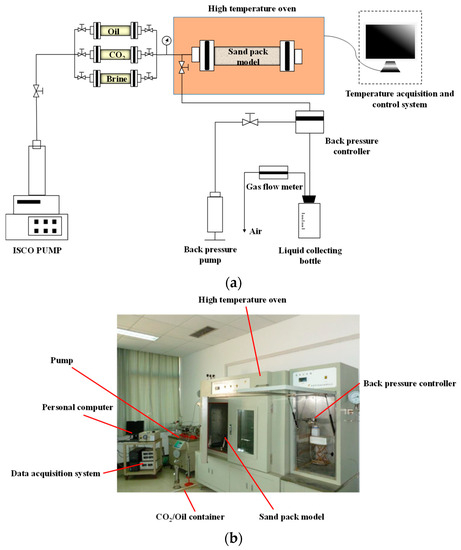 Experimental setup for CO2 huff-n-puff in tight oil reservoirs. (a) Diagrammatic sketch of CO2 huff-n-puff experimental setup. (b) Real experimental setup.